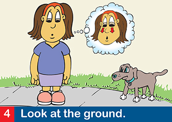 • By looking at the ground you are avoiding looking at the dog’s eyes, but you can still see where it is.
